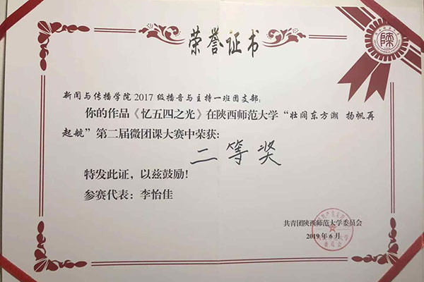 6月5日下午,由k1体育官方网站校团委主办,青年团校承办的第二届微团课大赛(员工组)决赛暨团支部活力风采展在k1体育官方网站长安校区教育博物馆主楼学术报告厅成功举办。决赛中,我院2017级播音与主持一班团支部获得本届微团课大赛员工组二等奖。此外,2017级新闻学斯诺班团支部以“激昂新时代”为主题的微团课亦在微团课大赛(员工组)中获特色团课奖。