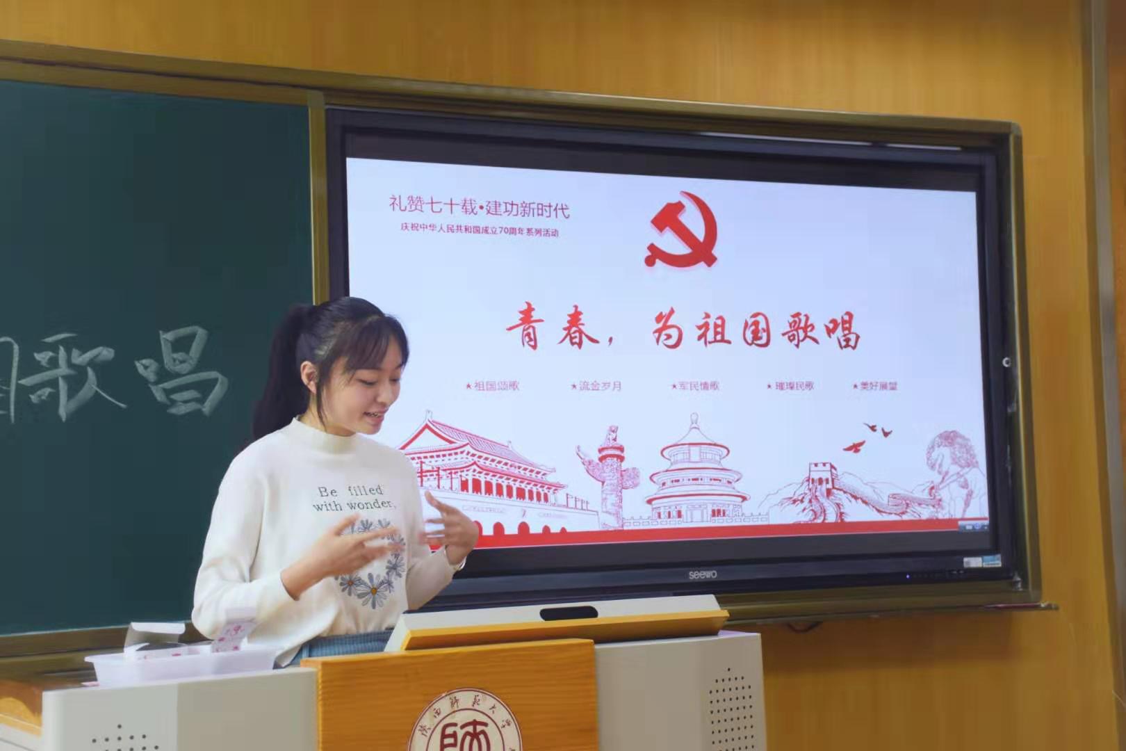 文艺作品源于国事民生,经典老歌唱出当年芳华,每一首歌曲的背后都有着属于那个时代的动人旋律。同学们补充展示了各个时代的图文资料,扩展了不同历史时期老歌所反映出的国情民生。将萦绕于脑海中亲切熟悉的旋律顺着时间轴一一串联,呈现出新中国成立70年来的风雨成长史、动人发展史、光荣复兴史。一曲终了,热泪盈眶,悠悠岁月在脑海重现,激励着同学们一同谱写新时代国家繁荣昌盛的新篇章。