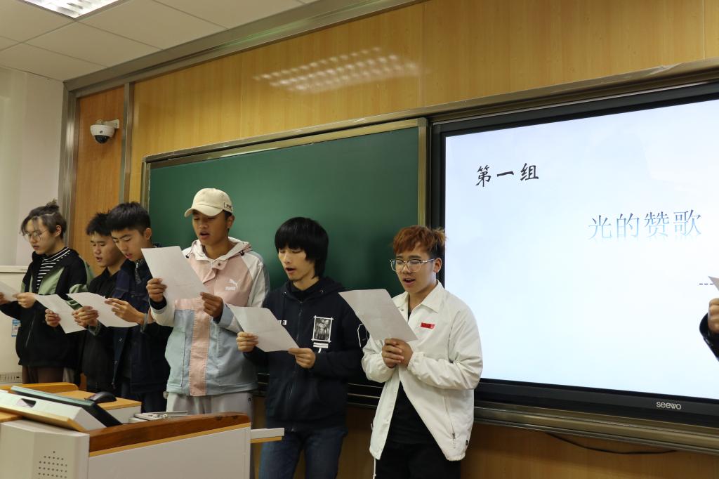 回顾往昔,无论经历了多少艰难困苦,中华人民的脊梁始终不屈。感慨万千的同时,我们也憧憬前方的光明。18级编辑出版班全体同学共同合唱《光荣啊,中国共青团》,青春的歌声飞扬,同学们内心的激动久久不能平静。董媛阁同学说:“青年一代不仅要做新时代的见证者,更要做新时代的建设者。要自觉学习知识技能,提升自我修养,增强自身能力,与祖国携手并进。”