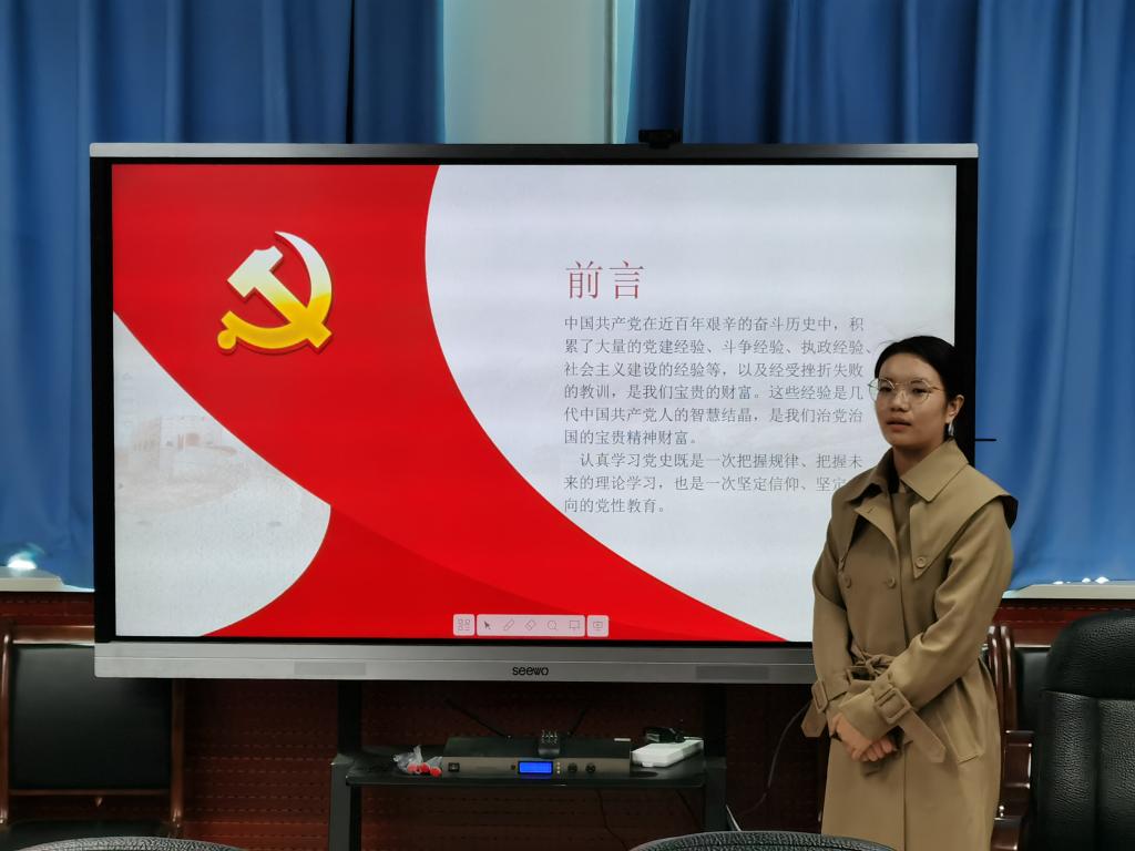 党支部书记贾丹阳从“党史发展脉络及其学习意义”“革命时期和建设时期”“社会主义现代化建设时期与改革开放”“步入新时代踏上新征程”四个方面讲述了一堂内容丰富的党课。