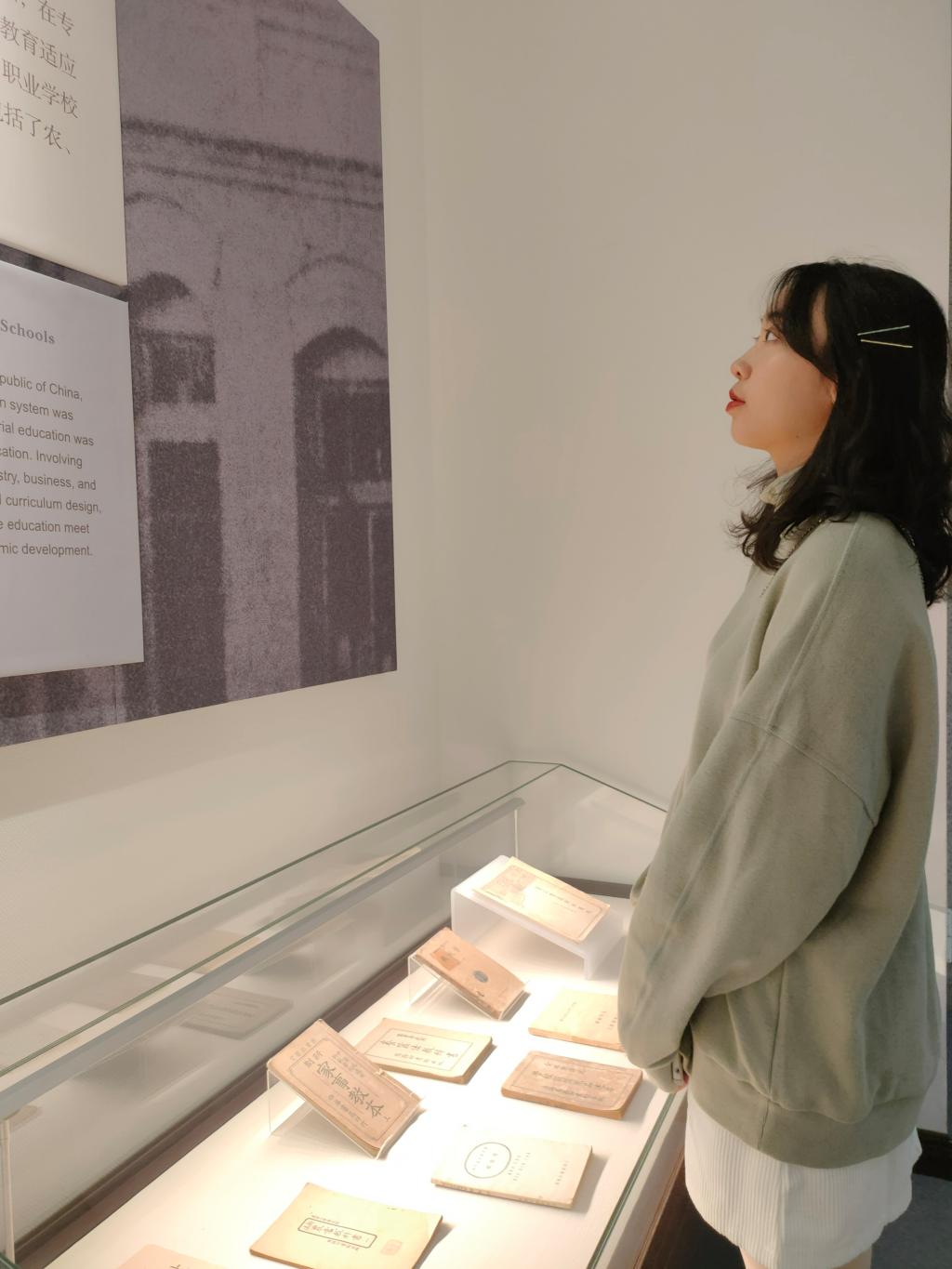 不忘来路,方知归处。漫步于师大教育博物馆的中国教育馆分馆,同学们如在“教育编年史”的字里行间中穿梭。作为物质文明和精神文明传承的载体,教育馆记录着教育发展的历史,承载着以人为本的教育精神。这里保存着许多关于教育发展的史料和实物。一张张老照片带领同学们回望近现代教育历史,实物则让历史更加真切、见证着历史的变迁。