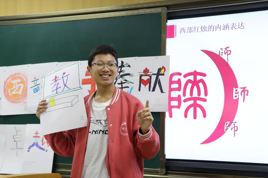活动结束后, 同学们纷纷表示受益匪浅。陈涵同学有感而发:“当看到我们设计的字按照‘扎根西部,甘于奉献。追求卓越,教育报国。’的顺序粘贴在黑板上,大家都深受触动,红烛精神不仅停留在口头和书面上,它开始扎根在我们心中,促使着我们不忘初心,继续前进,将来为祖国的发展添一份光热。”她的眼中充满坚定。